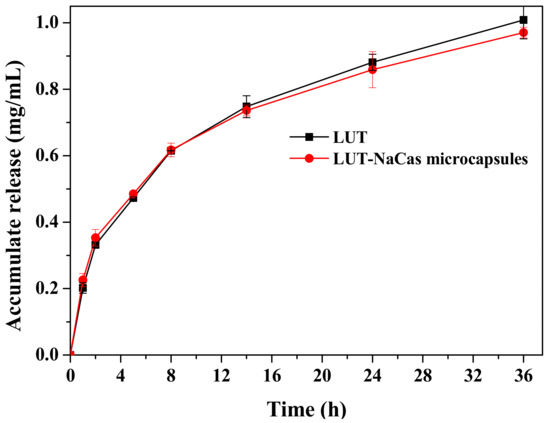 The lutein release behaviors from lutein crystal and the lutein-loaded microspheres microcapsules were investigated via in vitro release study. According to Figure 5, during the first 5 h, the lutein-loaded NaCas microcapsules released quickly from the dialysis tube in the shaker at 37 °C. The release profile of lutein from raw lutein was similar as that of the microencapsulated lutein. However, the release rates of lutein and lutein-loaded NaCas microcapsules began to show release differences after 14 h and the natural lutein started to release faster compared with the microsphere after then. Natural lutein had an accumulated release of 1.01 μg/mL at the 36 h point, while the lutein-enriched microsphere had an accumulated lutein release of 0.97 μg/mL. The mechanism of lutein release from the microcapsules might be controlled by swelling/erosion of wall material. Water molecules can penetrate into the matrix of the microcapsules leading to its swelling as the water diffuses from the outer solution into the matrix, the meshes of the polymeric network become increasing wider [39], allowing the lutein to diffuse into the outer aqueous environment. From then on, the release rate became slower than the initial 2 h, which was probably because of the long diffusion route of lutein entrapped deeply in the wall materials [40].
