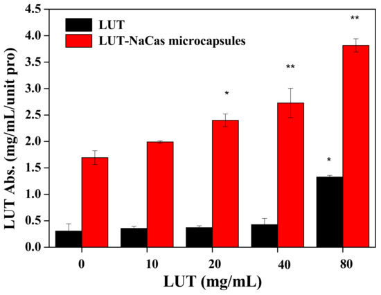 The in vitro absorption of lutein (LUT) and lutein-loaded NaCas microparticles in Caco-2 cells with different concentrations (0, 10, 20, 40, and 80 μg mL−1) after incubation for 12 h at 37 °C. Data are expressed as the mean ± SD (n = 3). Within the same samples, values with * are significantly different (p < 0.05), values with ** are significantly different (p < 0.01).