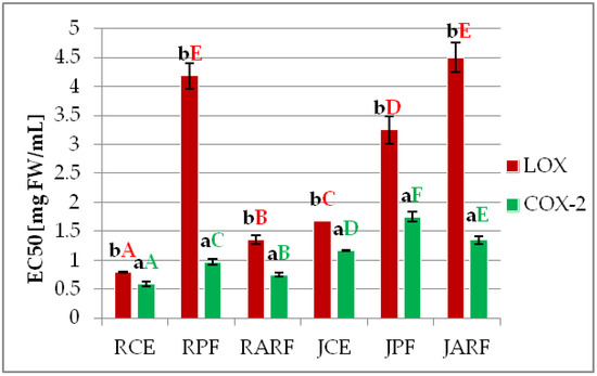 Anti-inflammatory activity of analyzed samples designated as LOX and COX-2 inhibitory activity—EC50 [mg FW/mL]. Abbreviations: RCE—raspberry crude extract, RPF—raspberry phenolic fraction, RARF—raspberry anthocyanin-rich fraction, JCE—raspberry juice crude extract, JPF—raspberry juice phenolic fraction, JARF—raspberry juice anthocyanin-rich fraction. Averages with different capital letters show significant differences between samples within one enzyme (red colour for LOX, green for COX-2) and with small letters show significant differences between enzymes (LOX and COX-2) inhibition by the same sample at p ≤ 0.05.
