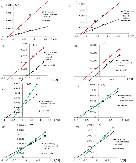 Mode of LOX (a–d) and COX (e–h) inhibition by analyzed extracts: RPF—raspberry phenolic fraction, RARF—raspberry anthocyanin-rich fraction, JPF—raspberry juice phenolic fraction, JARF—raspberry juice anthocyanin-rich fraction. Control—the activity of enzyme without tested extract.
