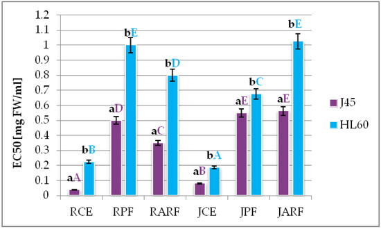 Cytotoxicity of analyzed extracts against J45 and HL60 cell lines [EC50 values]. RCE—raspberry crude extract, RPF—raspberry phenolic fraction, RARF—raspberry anthocyanin-rich fraction, JCE—raspberry juice crude extract, JPF—raspberry juice phenolic fraction, JARF—raspberry juice anthocyanin-rich fraction. Averages with different capital letters show significant differences between samples within one cell line (violet for J.45 and blue for HL60) and with small letters show significant differences between cell lines (J45 and HL60) viability inhibition by the same sample at p ≤ 0.05.