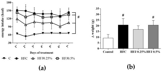 Energy intake in all the experimental diet groups (HFC, HFJ 0.5%, and HFJ 0.25%) was higher than that in the C group since the first day of the treatment probably due to the higher energy density of the experimental diets (p ≤ 0.043; Figure 1a). Compared with the C group, body weight gain (Δ) was increased in the HFC (p = 0.032) and HFJ 0.5% (p = 0.042) groups; however, there was no difference in body weight gain in the HFJ 0.25% group (Figure 1b).