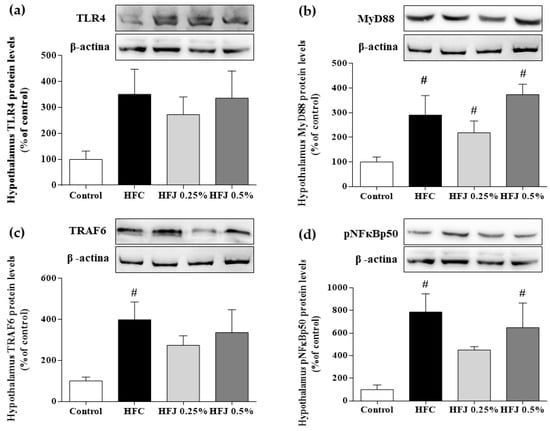 Although no difference was found in the protein expression of the TLR4 membrane receptor in the hypothalamus, a significant increase was found in the myeloid differentiation primary response gene 88 (MYD88) expression in the HFC, HFJ 0.25%, and HFJ 0.5% groups (p < 0.001, p = 0.003, and p = 0.004, respectively) compared with that in the C group. Compared with the C group, there was a significant increase in the TNF receptor-associated factor 6 (TRAF6) expression in the HFC group (p = 0.016). The phosphorylation of the nuclear transcription factor NF-κBp50 subunit in the HFC and HFJ 0.5% groups was higher than that in the C group (p = 0.016 and p = 0.032, respectively; Figure 3).