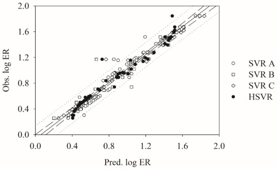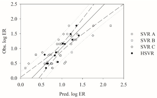 Observed log ER vs. the log ER predicted by SVR A (open circle), SVR B (open square), SVR C (open diamond), and HSVR (solid circle) for the molecules in the training set. The solid line, dashed line, and dotted lines correspond to the HSVR regression of the data, 95% confidence.