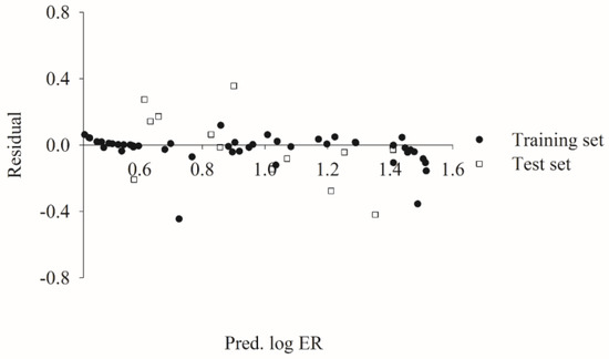 Figure 3 displays the scatter plots of the residual vs. the log ER values predicted by HSVR for the molecules in the training set and test set. It can be observed that the residuals are approximately evenly distributed on both sides of x-axis along the range of predicted values in both datasets, suggesting that there is no systematic error associated with the HSVR model [102]. The unbiased predictions can be further exhibited by its almost negligible average residuals that were −0.02 and −0.02 in the training set and test set, respectively (Table S1).