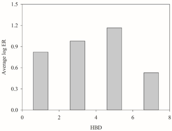 Figure 6 displays the average log ER for each histogram bin of HBD for all molecules selected in this study. It can be observed that the average log ER value initially increased with HBD when HBD was no more than 6 and then subsequently decreased when HBD was more than 6. Such positive dependence of log ER on HBD is, in fact, consistent with the analysis made by Hitchcock et al. [105]. However, those Amgen in-house compounds had HBD of no more than 5, leading to an only positive relationship between log ER and HBD. Such discrepancy in both systems can be conceivably attributed to the fact that the initial P-gp substrate binding can be enhanced by HBD as illustrated by the pharmacophore models of Penzotti et al. [47], whereas the consequent transport of the substrates into the extracellular environment can be hampered by too many HBDs, plausibly because of the increase in water desolvation energy [114] and the decrease in membrane fluidity [115]. As such, a nonlinear relationship between HBD and log ER was yielded consequently.