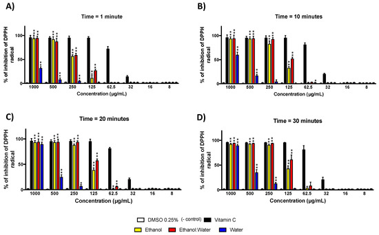 DPPH radical inhibition of three LT extracts at different concentrations (1000 μg/mL–8 μg/mL and at four time points: (A) time = 1 min, (B) time = 10 min, (C) time = 20 min and (D) time = 30 min. The concentration of the DPPH radical was 100 μM. The absorbance was measured at 517 nm. Each bar represents the average of three replicates and the error bars represent the standard deviation. The asterisks indicate a significant difference between the treatment and negative control (* p < 0.05 and ** p < 0.001).