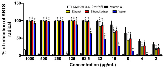 ABTS radical cation inhibition of three LT extracts at different concentrations (1000 μg/mL–2 μg/mL after 20 min incubation. The concentration of the ABTS was 100 μM. Each bar represents the average of three replicates and the error bars represent the standard deviation. The asterisks indicate a significant difference between the treatment and negative control (* p < 0.05 and ** p < 0.001).