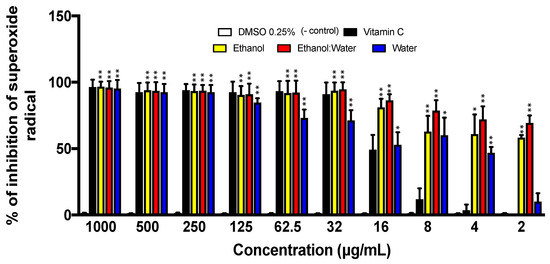 Superoxide scavenging activity of three LT extracts at different concentrations (1000 μg/mL–2 μg/mL) after 20 min incubation. Each bar represents the average of three replicates and the error bars represent the standard deviation. The asterisks indicate a significant difference between the treatment and negative control (* p < 0.05 and ** p < 0.001).