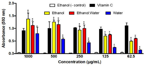 Iron Reducing Antioxidant Potential (FRAP) of three LT plant extracts at different concentrations (1000 μg/mL–62.5 μg/mL) after 5 min of incubation. The absorbance was recorded at 593 nm. Each bar represents the average of three replicates and the error bars represent the standard deviation. The asterisks indicate a significant difference between the treatment and negative control (* p < 0.05 and ** p < 0.001).