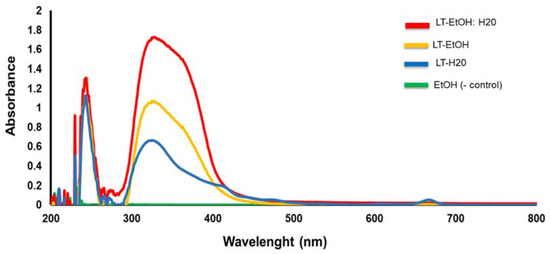 UV visible absorption analysis, between 200–800 nm, of LT-EtOH: H2O extract (red color); LT-EtOH extract (orange color) and LT-H2O extract (blue color). The absorption of EtOH alone (green color) was used as a negative (−) control.