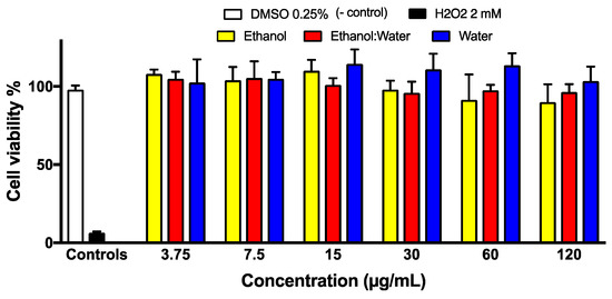 The non-cancerous human skin fibroblasts Hs27 cells were exposed to different concentrations (3.79–120 μg/mL) of the three LT extracts (LT-ethanol, LT-ethanol: water and LT-water) at 24 h of incubation. DMSO at 0.25% and H2O2 at 2 mM, the known cytotoxic small molecule, were used as negative and positive controls, respectively (Figure 8). Based on our cell viability assay, the 3 LT extracts did not alter the HS27 cells and showed low cell death that is similar to DMSO, the negative control (Figure 8).