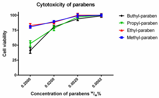 Based on our experimental design, we tested two complex formulations containing different parabens to evaluate their cytotoxic and antimicrobial interference and to investigate how these materials influence the safety and efficacy of parabens on human cells, bacteria and fungi—E. coli, P. aeruginosa, S. aureus, C. albicans, C. parapsilosis, C. glabrata. The antimicrobial stability can depend on the formulation and the different excipients used in the product. Ribes et al. have found that the antimicrobial effect of cinnamon leaf essential oil can be heavily enhanced by a nanoemulsion of emulsifying agents [34]. Han et al. also investigated the effects of preservatives and they found that there are multiple preservatives which influence the stability of Diprivan® injection (an intravenous anaesthetic emulsion) in an undesirable way [35].