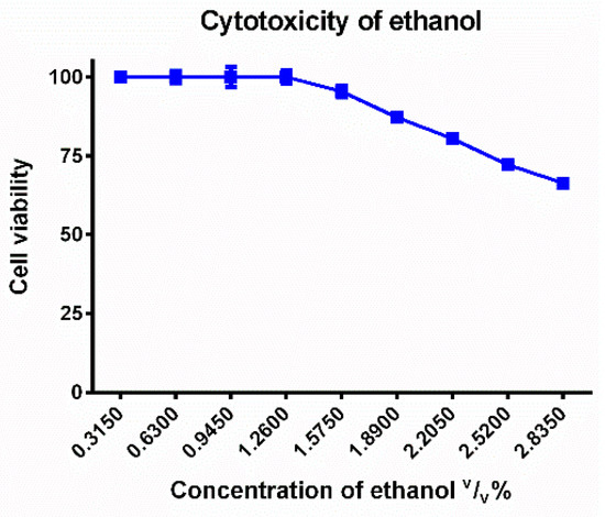 Cytotoxicity of ethanol measured by MTT-assay. Cell viability expressed as the percentage of the absorbance of the untreated control cells. Data expressed as mean ± SEM, n = 12. Cell viability of the samples at the different concentrations: 100% ± 0.2%; 100% ± 1.8%; 100% ± 3.1%; 100% ± 2%; 95% ± 1.7%; 87% ± 0.5%; 81% ± 1.1%; 72% ± 0.9%; 66% ± 1%.