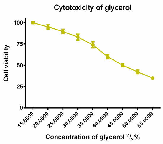 Cytotoxicity of glycerol measured by MTT-assay. Cell viability expressed as the percentage of the absorbance of the untreated control cells. Data expressed as mean ± SEM, n = 12. Cell viability of the samples at the different concentrations: 100% ± 1.1%; 95% ± 2.5%; 90% ± 2.5%; 83% ± 3.4%; 74% ± 3.6%; 60% ± 2.5%; 50% ± 1.7%; 42% ± 2%; 35% ± 0.4%.