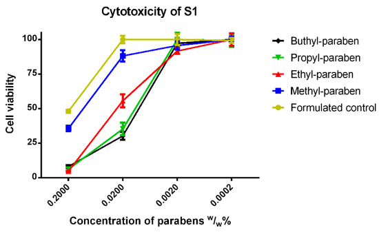 The cytotoxicity of S1 can be seen in Figure 6. The formulated control was highly toxic, and the cell viability was less than 50% compared to the untreated control at the original concentration. MP had the highest survivability from all esters, the second was EP. The results of the two longer parabens were not significantly different from each other at the tested concentrations. Moreover, the methyl paraben was not significantly different from the formulated control, but at the original concentration and at tenfold dilution, along with ethyl paraben, these derivatives were different from the longer ones. All statistical differences between the test solutions diminished at hundredfold and thousand-fold dilutions.