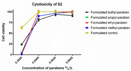 It was found that in our test systems the relative toxicity of parabens was different in these two formulated systems, and the ranking of toxicity was not general. The parabens alone, presented the ranking of BP > PP > EP > MP as butyl paraben was the most toxic. In most scientific studies, such as the publication of Dagher et al., it was reported that the cytotoxicity increased with the length of alkyl chains as well [38]. They investigated that MP was the least toxic on MCF7 breast cancer cells, while the cytotoxicity of more lipophilic parabens (BP and benzyl paraben) eventually increased. While the S1 had identical results, in S2, the other excipients could modify the ranking, BP at the highest concentration was the safest paraben.