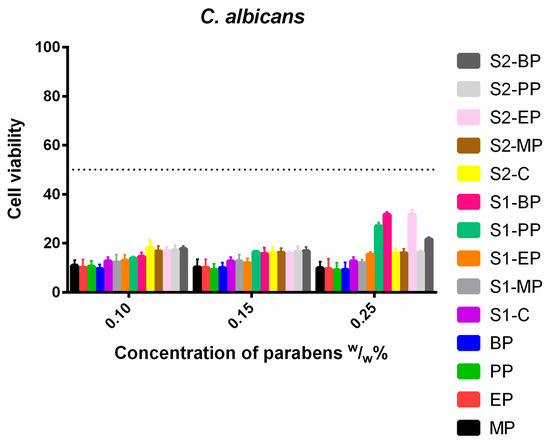 Cell viability of C. albicans against the control paraben solutions (MP; EP; PP; BP); the first system (S1-MP; S1-EP; S1-PP; S1-BP) and the second system (S2-MP; S2-EP; S2-PP; S2-BP). Cell viability expressed as the percentage of the absorbance of the untreated control. Data expressed as mean ± SEM, n = 4. Cell viability of fungal cells at 0.1; 0.15; 0.25 (w/w)% concentrations of different formulations containing parabens: MP: 11% ± 2.2%; 10% ± 3.2%; 10% ± 2.5%; EP: 10% ± 3.3%; 10% ± 3.4%; 10% ± 4.1%; PP: 11% ± 2.2%; 9% ± 2.3%; 9% ± 3%; BP: 10% ± 1.7%; 10% ± 2.2%; 9% ± 3%; formulated control of S1: 13% ± 1.7%; formulated MP of S1: 12% ± 3.1%; 13% ± 2.7%; 12% ± 1.4%; formulated EP of S1: 12% ± 2.3%; 12% ± 1.9%; 16% ± 0.9%; formulated PP of S1: 14% ± 0.7%; 16% ± 0.5%; 27% ± 1.3%; formulated BP of S1: 15% ± 1.6%; 16% ± 2.5%; 32% ± 1%; formulated control of S2: 18% ± 3.3%; 16% ± 2.5%; 16% ± 2%; formulated MP of S2: 17% ± 2.1%; 16% ± 1.7%; 16% ± 1.7%; formulated EP of S2: 17% ± 1.5%; 16% ± 0.8%; 32% ± 2%; formulated PP of S2: 17% ± 1.8%; 16% ± 2.2%; 16% ± 0.9%; formulated BP of S2: 18% ± 1.2%; 17% ± 1.7%; 22% ± 0.8%.