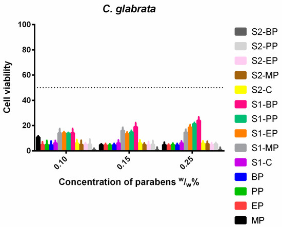 Cell viability of C. glabrata against the control paraben solutions (MP; EP; PP; BP); the first system (S1-MP; S1-EP; S1-PP; S1-BP) and the second system (S2-MP; S2-EP; S2-PP; S2-BP). Cell viability expressed as the percentage of the absorbance of the untreated control. Data expressed as mean ± SEM, n = 4. Cell viability of fungal cells at 0.1; 0.15; 0.25 (w/w)% concentrations of different formulations containing parabens: MP: 11% ± 1.1%; 5% ± 0.7%; 5% ± 2%; EP: 5% ± 2.3%; 4% ± 1.2%; 4% ± 0.9%; PP: 5% ± 3.2%; 4% ± 1%; 5% ± 1.2%; BP: 5% ± 3%; 5% ± 1.1%; 4% ± 1.2%; formulated control of S1: 6% ± 1.6%; formulated MP of S1: 14% ± 3.4%; 16% ± 2.5%; 15% ± 2.5%; formulated EP of S1: 14% ± 1.1%; 13% ± 1.4%; 19% ± 2%; formulated PP of S1: 14% ± 0.7%; 15% ± 1.4%; 21% ± 1%; formulated BP of S1: 14% ± 3.4%; 19% ± 3.2%; 24% ± 2.9%; formulated control of S2: 6% ± 2.9%; 6% ± 2.5%; 6% ± 2%; formulated MP of S2: 5% ± 3.4%; 5% ± 1.4%; 5% ± 2%; formulated EP of S2: 5% ± 1.4%; 5% ± 2.8%; 5% ± 1.7%; formulated PP of S2: 5% ± 4.1%; 5% ± 3.2%; 5% ± 1%; formulated BP of S2: 1% ± 0.9%; 1% ± 0.8%; 1% ± 0.9%.