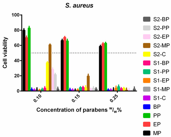 Cell viability of S. aureus against the control paraben solutions (MP; EP; PP; BP); the first system (S1-MP; S1-EP; S1-PP; S1-BP) and the second system (S2-MP; S2-EP; S2-PP; S2-BP). Cell viability expressed as the percentage of the absorbance of the untreated control. Data expressed as mean ± SEM, n = 4. Cell viability of bacterial cells at 0.1; 0.15; 0.25 (w/w)% concentrations of different formulations containing parabens: MP: 80% ± 2.2%; 66% ± 1.9%; 59% ± 1.5%; EP: 70% ± 2.4%; 70% ± 1.3%; 62% ± 1.6%; PP: 83% ± 2.3%; 66% ± 2.5%; 63% ± 1.4%; BP: 2% ± 1.1%; 1% ± 0.9%; 1% ± 0.4%; formulated control of S1: 1% ± 0.3%; formulated MP of S1: 2% ± 1.4%; 1% ± 0.5%; 1% ± 0.8%; formulated EP of S1: 1% ± 0.2%; 1% ± 0.4%; 4% ± 2.8%; formulated PP of S1: 2% ± 1.6%; 4% ± 1.3%; 6% ± 2.4%; formulated BP of S1: 4% ± 2.1%; 5% ± 1.6%; 3% ± 1.5%; formulated control of S2: 37% ± 1.6%; 4% ± 2.7%; 4% ± 1.1%; formulated MP of S2: 61% ± 1.2%; 20% ± 2.6%; 1% ± 0.5%; formulated EP of S2: 28% ± 2.4%; 2% ± 1.3%; 1% ± 0.9%; formulated PP of S2: 22% ± 1.7%; 4% ± 2.1%; 0% ± 0% +0.3%; formulated BP of S2: 3% ± 2.5%; 3% ± 1.8%; 3% ± 2.9%.