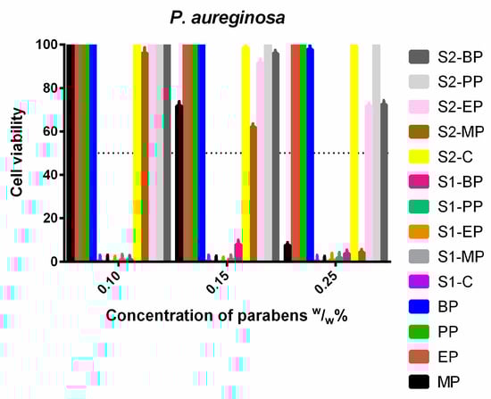 Cell viability of P. aeruginosa against the control paraben solutions (MP; EP; PP; BP); the first system (S1-MP; S1-EP; S1-PP; S1-BP) and the second system (S2-MP; S2-EP; S2-PP; S2-BP). Cell viability expressed as the percentage of the absorbance of the untreated control. Data expressed as mean ± SEM, n = 4. Cell viability of fungal cells at 0.1; 0.15; 0.25 (w/w)% concentrations of different formulations containing parabens: MP: 100% ± 2.2%; 72% ± 2.0%; 7% ± 1.2%; EP: 100% ± 2.1%; 100% ± 2.3%; 100% ± 1.7%; PP: 100% ± 1.7%; 100% ± 1.2%; 100% ± 1.8%; BP: 100% ± 1.3%; 100% ± 1.4%; 98% ± 2%; formulated control of S1: 0% + 0.4%; formulated MP of S1: 0% + 0.2%; 0% + 0.3%; 0% + 0.1%; formulated EP of S1: 0% + 0.2%; 0% + 0.2%; 0% + 0.3%; formulated PP of S1: 1% + 0.5%; 1% + 0.3%; 1.8% + 0.4%; formulated BP of S1: 1% + 0.1%; 8% ± 2.1%; 4% ± 1.7%; formulated control of S2: 100% ± 2.6%; 99% ± 1.4%; 99% ± 1.7%; formulated MP of S2: 96% ± 2.5%; 62% ± 1.5%; 4% ± 1.3%; formulated EP of S2: 100% ± 2%; 92% ± 1.7%; 72% ± 1.3%; formulated PP of S2: 100% ± 2.1%; 100% ± 1.6%; 100% ± 1.8%; Formulated BP of S2: 100% ± 2%; 96% ± 1.4%; 72% ± 1.9%.