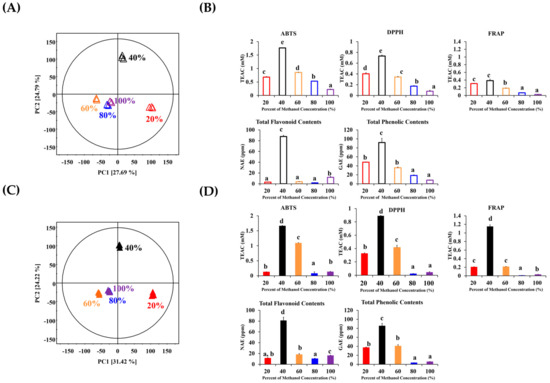 Principal component analysis (PCA) score plot (A) and (C) from UHPLC-LTQ-IT-MS/MS; antioxidant activity assays using ABTS, DPPH radical scavenging, FRAP, TFC, and TPC assays (B) and (D) derived from stepwise SPE extracts of A. aspera (unfilled column) and Z. serrata (filled column): red column 20% SPE extract, black column 40% SPE extract, orange column 60% SPE extract, blue column 80% SPE extract, and violet column 100% SPE extract.