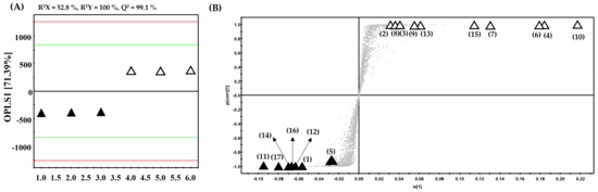 Multivariate statistical analysis of LC-MS datasets for 40% methanol SPE extracts of A. aspera (unfilled triangles) and Z. serrata (filled triangles): (A) OPLS-DA score plot, with VIP >1.0 and p-value <0.05 marked; (B) loading S-plot based on OPLS-DA. Numbers labeling each sample′s discriminant metabolites on the plot correspond to entries in Table 1.