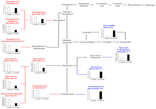 The partially purified (40% SPE extracts) samples were further analyzed using UHPLC-LTQ-IT-MS/MS, followed by multivariate statistical analysis and ultra-performance liquid chromatograph quadrupole-time-of-flight MS (UPLC-Q-TOF-MS) methods to examine the distinct metabolic entities having significantly higher antioxidant activities. The LC-MS-based orthogonal partial-least-squares discriminant analysis (OPLS-DA) plots (Figure 2A) displayed an overall 71.39% variance along OPLS1 with satisfactory R2X (52.8%), R2Y (100%), and Q2 (99.1%) values. Further, an S-plots of OPLS-DA based on the loading was constructed (Figure 2B) to discover and visualize significant variables contributing to the differentiation of the selected SPE extracts among the two Ulmaceae species. In the S-plot, longer distances from the midpoints of the selected variables signify higher metabolic disparity between the two species. Accordingly, we determined a total of 17 metabolites as largely discriminant contributing to the maximum metabolomic disparity between the two Ulmaceae species at VIP > 1.0 and p-value < 0.05. The discriminant metabolites were putatively identified based on their retention times, mass to charge ratios (m/z), MSn fragment patterns, and UV λmax (nm) data obtained through UHPLC-LTQ-IT-MS/MS analysis, as well as by annotations using an in-house library and literature [15,16,17,18,19]. In addition, mass errors (mDa) and elemental composition data obtained from the UPLC-Q-TOF-MS analysis data are used to support the putative metabolite identities (Table 1). Further, we presented a scheme of the metabolic pathways describing the biosynthetic routes of discriminant metabolites (Figure 3); unfilled and filled columns indicate their relative abundance in A. aspera and Z. serrata, respectively. Notably, the 40% SPE extracts displayed a significant disparity with respect to O-glucosylated isorhamnetin and quercetin (2, 4, 6, 8, and 9) and for the O-glycosylation of kaempferol (3, 7, 10, and 13), with relatively higher abundance in A. aspera. Meanwhile, quercetin O-rhamnosyl rutinoside (1), isorhamnetin and quercetin O-glucuronides (5 and 11), and procyanidin dimer (12) levels were relatively higher in Z. serrata. We conjecture that the varying degrees of glycosylation of flavonols contribute maximally to the observed disparity between the Ulmaceae plant species. Previously, various quercetin and kaempferol derivatives were reported to be present in Z. serrata; hence, these compounds could serve as important biomarkers toward annotating discriminant metabolites among the Ulmaceae species [20,21]. In addition, it was reported that aglycones varied with respect to the degree of glycosylation and localization within plant tissues in different species, and thus could influence their physiochemical traits [22]. Considering these studies, we propose that O-glycosylated kaempferol, glucosylated isorhamnetin, and quercetin are highly abundant in A. aspera extracts, whereas glucuronidated quercetin, isorhamnetin, and procyanidin dimer levels are significantly higher in Z. serrata extracts. Based on this, we can propose that sugar derivatives of the flavonols seem to significantly affect the observed metabolic disparities between the two examined Ulmaceae species.