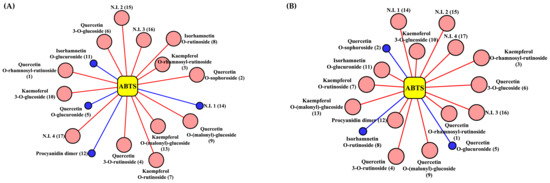Visualization of the correlation networks between the identified secondary metabolites and ABTS radical scavenging activity assay of A. aspera (A) and Z. serrata (B) according to Pearson′s correlation coefficient. Correlation coefficients higher than 0.80 or lower than −0.80 with p-value < 0.05 are extracted and shown in these association networks. Each node indicates an identified metabolite and corresponding ABTS assay. Yellow node = antioxidant activity assay, Pink node = positively correlated metabolite, Blue node = negatively correlated metabolite. The sizes of the nodes represent the degrees of association. The numbers on the metabolites are those indicated in Table 1.