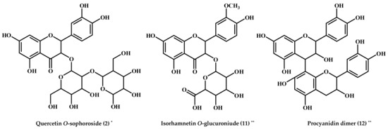 In the networks, we found that the correlation tendencies between the two species are slightly different. Hence, we further examined the major antioxidant metabolites in the partially purified 40% SPE extracts from A. aspera and Z. serrata using preparative HPLC (Prep-HPLC), followed by ABTS assay for the collected fractions. Prep-HPLC analysis is commonly employed as a metabolite isolation strategy because of its outstanding separation and purification efficiency. A total of 75 fractions of each sample were acquired, followed by ABTS assays of each of the two sample extracts. Further, the selected fractions with considerably higher antioxidant activities were subjected to UPLC-Q-TOF-MS analysis to identify their metabolite components. In this step, we primarily identified quercetin O-sophoroside (2) from 12 min, quercetin O-rutinoside (4) from 15 min, quercetin O-glucoside (6) from 16 min, non-identified compound 2 (N.I. 2) (15) in 22 min, and kaempferol O-(malonyl)-glucoside (13) in 24 min prep-HPLC fractions of the A. aspera SPE extracts (Figure 5A). Quercetin O-rhamnosyl rutinoside (1) in 11 min and isorhamnetin O-glucuronide (11) and procyanidin dimer (12) in 24 min fractions were identified as the strong antioxidant candidate metabolites in Z. serrata contributing to the metabolic disparity (Figure 5B). Previously, it was reported that the antioxidant activity of the extracts was influenced by the proportional contents of the metabolites, as displayed statistically through the correlation analysis [23]. Specifically, quercetin O-sophoroside (2) displayed a positive correlation with ABTS antioxidant activity only in A. aspera extracts, and thus was chosen as the strong antioxidant compound in the prep-HPLC fractions. On the other hand, isorhamnetin O-glucuronide (11) and procyanidin dimer (12) were selected as the strong antioxidants in Z. serrata extracts with positive correlations to the ABTS activity. Structurally, the quercetin O-sophoroside (2) is a quercetin derivative of O-sophoroside known for its antioxidant activities. As shown in Figure 6, the specific OH− groups at the 3′ and 4′ carbons of the B-ring and the 3 and 4 carbons of the C-ring engender the strong antioxidant effects of quercetin O-sophoroside [24,25]. The isorhamnetin O-glucuronide (11) structure consists of O-methylated quercetin linked with O-glucuronoside, where the B-ring OH− groups also transfer hydrogen atoms and electrons to hydroxyl, peroxyl, and peroxynitrite radicals [25]. The procyanidin dimer (12) belongs to the family of proanthocyanidins and is composed of (−)-epicatechin or (+)-catechin units, linked through C4→C8 of the two flavan-3-ol groups, yielding a characteristics inter-flavonoid linkage [26]. Similar to the first three compounds, the antioxidant activity of the proanthocyanidins is also affected by the number of OH− groups scavenging the free radicals [27]. In addition, the inter-flavonoid C4→C8 bond reportedly enhances the antioxidant properties of procyanidin dimers [28]. Hence, it can be stated that the selected three metabolites are the principally different variables contributing to the potent antioxidant activities in each of the two Ulmaceae species; they may contribute to the subtle metabolic disparities between these closely related plant species.