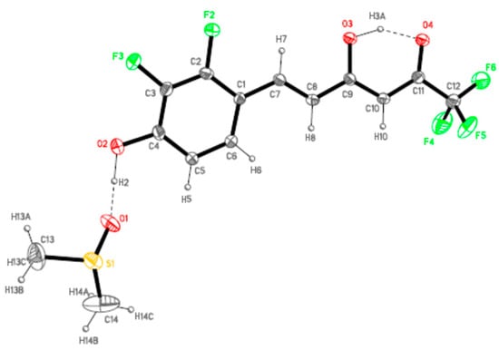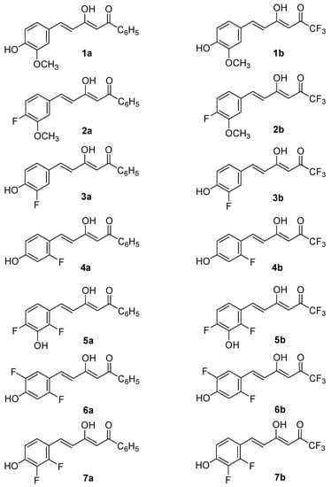 Compounds 7a and 7b are described here for the first time, all others were previously prepared and their structural characterization already reported by us [77,78,79]. The NMR spectra confirm in both cases that the predominant tautomer corresponds to the enol close to the styryl group. In (2Z,4E)-5-(2,3-difluoro-4-hydroxyphenyl)-3-hydroxy-1-phenylpenta-2,4-dien-1-one (7a), the chemical shift of the OH is observed at 16.26 ppm (DMSO-d6) and in (3Z,5E)-6-(2,3-difluoro-4-hydroxyphenyl)-1,1,1-trifluoro-4-hydroxyhexa-3,5-dien-2-one (7b) at 14.15 ppm (CDCl3). In 13C-NMR the most representative values confirming it are: 7a, C6H5CO-, 188.5 (CPMAS, 192.1), =CHCO, 97.8 (CPMAS, 98.2) and CH=C(OH), 179.3 (CPMAS, 176.1) ppm and 7b, CF3CO-, 179.3, =CHCO, 95.0 and CH=C(OH), 180.6 ppm [79,80].