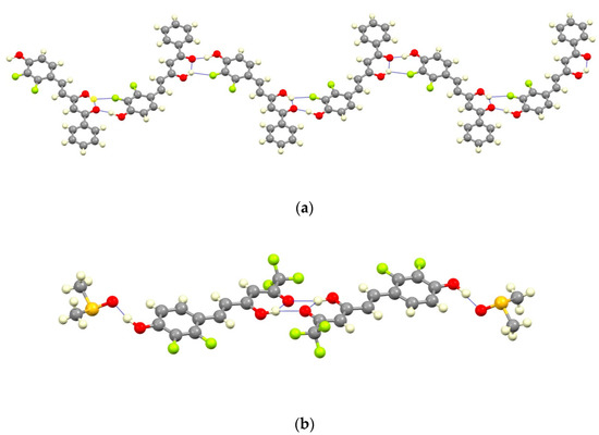 For 7a two different intermolecular interactions can be described, a strong hydrogen bond between the phenolic group and the ketonic oxygen (O2H2···O4#1; Table 1) and, an additional weaker interaction between the enol hydrogen and the F3 atom in ortho position relative to the phenolic group (distance O3H3A···F3#1 of 2.264(6) Å). These intermolecular hydrogen bonds between adjacent coplanar molecules lead to the formation of zig-zagged chains as shown in Figure 5; there are no significant additional interactions between adjacent chains.