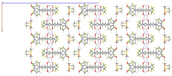 The presence of DMSO molecules in compound 7b determines the intermolecular interactions. In that way, the phenolic group of 7b forms a hydrogen bond with the oxygen of the DMSO molecule, preventing the interaction with the ketonic oxygen O4 found in 7a. For that reason, the ketonic groups of two adjacent molecules are oriented to each other giving rise to the formation of a double hydrogen bond [distances O3H3A···O4#1 of 2.652(5) and O3···O4#1 3.158(5) Å; angle O3H3AO4 of 107.32(3)°] leading to isolated dimers (Figure 5). The sum of these interactions affords a crystal packing where the molecular dimers are alternating with layers of DMSO molecules (Figure 6).