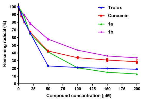 Regarding the DPPH assay, which measures the AOX capacity of compounds capable of donating a hydrogen atom or an electron to the DPPH• radical [90,91], compounds 1a and 1b were the only β-diketones that have shown activity in this assay. Table 3 displays the IC50 values obtained for trolox, curcumin and compounds 1a and 1b, while Figure 7 presents also the percent of remaining DPPH• radical vs. compound concentration. Derivatives 1a and 1b have slight lower potencies (greater IC50 values) than those from curcumin and trolox. The fact that only 1a and 1b have DPPH reductive capacity was expected, considering that they keep the methoxy group in alpha position to the phenolic OH. In addition to that, the lack of DPPH activity observed for the fluorinated derivatives, confirms an acidity increase of the phenolic group, produced by the introduction of fluorine atoms in the aromatic ring, which makes the phenolic hydrogen less labile, in agreement with previous results [92].