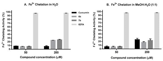 To decrease the level of free Fe2+ that can reduce H2O2 to the •OH radical and produce other ROS, it is worth to evaluate the iron chelation capacity of new potential AOX compounds as potential new therapeutic agents against neurodegenerative diseases [106,107]. In the present work, the Dini’s method [108] was used to evaluate the Fe+2 chelating capacity of compounds 6b and 7b and curcumin, using EDTA as assay control. In this assay ferrozine form complexes with Fe+2 in a quantitative manner, and in the presence of chelating compounds this complex is disrupted. Figure 8A shows the results obtained when the assay was run in aqueous media. At lower compound concentration (50 µM), 6b and 7b show similar Fe2+ binding capacity (7–8%) to that of curcumin (8%), while at higher concentrations (200 µM) their chelating capacity (25–26%) is higher than that of curcumin, mainly due to their better solubility in aqueous media. When the assay was carried out in a mixture MeOH:H2O (1:1), (Figure 8B), the three compounds show a similar Fe+2 binding pattern at 50 and 200 µM, where curcumin has shown similar chelating capacity as that previously reported by Dairam et al. [109]. In all the experiments, EDTA completely inhibits the Fe+2-Ferrozine complex at both 50 and 200 µM. In summary, compounds 6b and 7b have better iron chelation capacity than curcumin in aqueous media, being this feature interesting for potential intracellular Fe+2 chelation.
