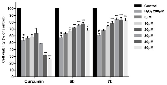 Neuroprotection effect of curcumin, 6b and 7b against H2O2 induced cytotoxicity in SH-SY5Y cells. Cell viabilities were obtained by MTT assay. Compounds were administered at different concentrations for 24 h prior to H2O2 200 µM treatment for other 24 h. Data are presented as Mean ± SD of four independent experiments carried out by quadruplicate. # p < 0.001 vs. vehicle-treated control. * p < 0.05, ** p < 0.01, *** p < 0.001 vs. only H2O2 treated cells.