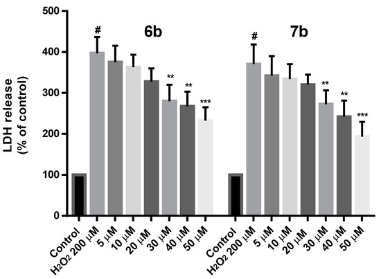 Additionally, the protection effect of 6b and 7b on cell death induced by 200 µM H2O2 was determined by measuring the lactate dehydrogenase (LDH) release in cell culture medium. As shown in Figure 11, both 6b and 7b reduced the LDH leakage at all the concentrations tested, being this effect more significant at 30, 40 (p < 0.01) and 50 µM (p < 0.001).