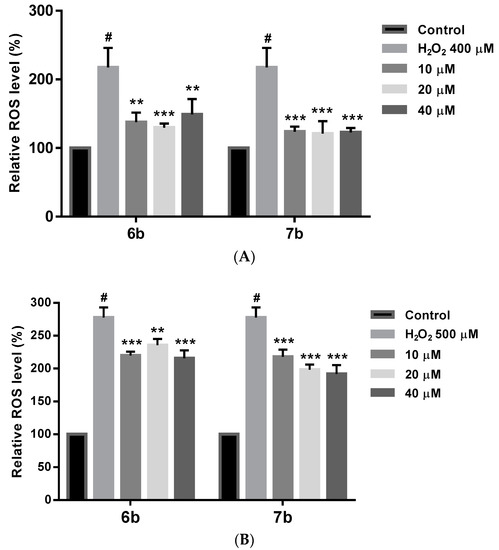 Oxidative stress increases ROS levels, which may cause cell damage and death. Therefore, ROS production caused by H2O2 was evaluated in cells pretreated with or without derivatives 6b and 7b. In these studies, DFCH-DA method was used to measure by fluorescence the ROS intracellular levels [110], under two different compound treatment regimens. In the first assay, (Figure 12A) a 24 h compound treatment prior to 400 µM H2O2 exposure for 4 h, afforded a significant ROS level reduction at all the doses assayed, being more significant that reduction for 7b (p < 0.001). In a second study (Figure 12B) a 6 h treatment with 6b and 7b followed by 2 h 500 µM H2O2 exposure has also shown a significant ROS level decrease after compounds treatment. From both experiments, it could be concluded that 6b and 7b reduce intracellular ROS, and that longer treatment period seems to be needed to achieve a better ROS reduction.