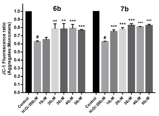MMP loss is prevented by compounds 6b and 7b in SH-SH5Y under 24 h exposure with 200 µM H2O2. Cells were treated with 6b and 7b for 24 h prior exposure to H2O2. MMP is expressed as JC-1 fluorescence ratio in terms of red fluorescence to green fluorescence (Aggregates:Monomers). Data are presented as Mean ± SD of five independent experiments carried out by quadruplicate. # p < 0.001 vs. vehicle-treated control. * p < 0.05, ** p < 0.01, *** p < 0.001 vs. only H2O2 treated cells.