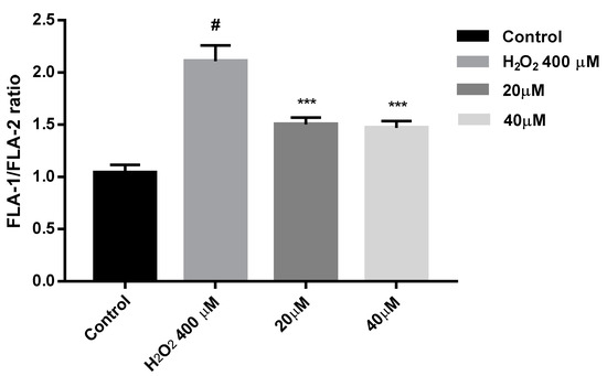 To confirm this MMP recovery results, flow cytometry experiments were carried out with compound 7b and SH-SY5Y cells. Cells were treated with 7b for 24 h and then were exposed to 400 µM H2O2 for 4 h. JC-1 was used as fluorescence indicator of MMP state. In flow cytometry studies of MMP, JC-1 is excited at 488 nm wavelength. Both JC-1 aggregates and monomers show green fluorescence (peak emission at 527 nm) measured in the FL1 channel. JC-1 aggregates exhibit red fluorescence (peak emission at 590 nm) measured in the FL2 channel. Thus, healthy non-apoptotic cells are detected in both FL1 and FL2 channels, while cells with disrupted mitochondrial function show fluorescence in FL1 channel but reduced FL2 intensity [112]. Results obtained from this study (Figure 14) show that cells under oxidative stress induced by 400 µM H2O2, presented a 2-fold increase in the FLA-1/FLA-2 ratio, while those previously treated with 7b and then with 400 µM H2O2 for 4 h, exhibit a significant reduction of that ratio. From these flow cytometry experiments, we can confirm that after compound 7b treatment there is a significant MMP recovery in SH-SY5Y cells under oxidative stress pressure.