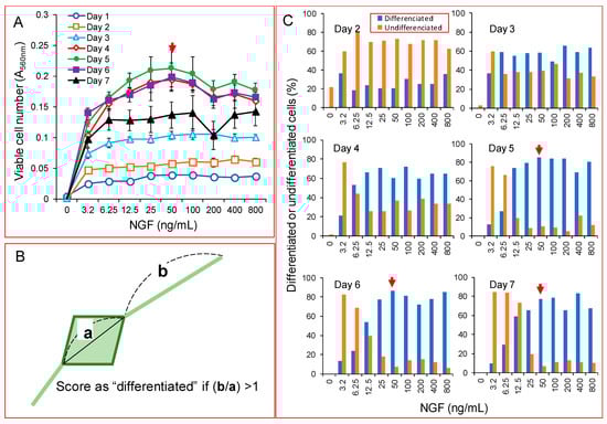 We first confirmed that NGF stimulated the growth of PC12 cells at the optimal concentration of 50 ng/mL in our assay system. The cell number increased up to day five, and thereafter, slightly declined, possibly due to it reaching the terminal differentiation (Figure 1A). NGF also stimulated the formation of neurite—the marker of neuronal differentiation. When differentiated cells were defined as the cells in which the extended neurite exceeds the longest diameter of each cell (Figure 1B), the percentage of differentiated cells reached a plateau at day five, with a maximum of 50 ng/mL NGF (Figure 1C).