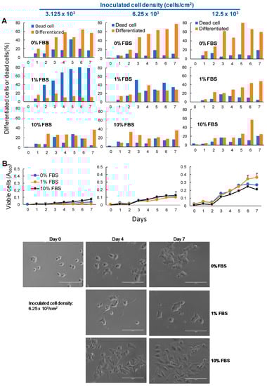 FBS reduced the neuronal differentiation of PC12 cells. PC12 cells were seeded at 3.125, 6.25 and 12.5 × 103/cm2 into a 96-microwell plate. After 24 h, cells were replaced with DMEM supplemented with 0%, 1% or 10% FBS containing 50 ng/mL NGF, and were incubated for zero, four or seven days, with a one-time supplementation of NGF overlay at day three. The percentage of differentiated cells and undifferentiated cells (defined in the legend of Figure 1) (A), viable cell number (B) and morphological changes were monitored. To score the number of differentiated cells, the morphology of more than 100 cells were observed under the light microscope.