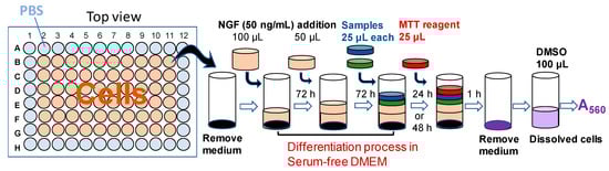 To the culture medium, a fresh medium containing 3-(4,5-dimethylthiazol-2-yl)-2,5-diphenyltetrazolium bromide (MTT) (final concentration: 0.1 mg/mL) with (for differentiated cells) or without (for non-differentiated cells) of 50 ng/mL NGF. The cells were incubated for 1 h, and the formazan precipitate was dissolved in DMSO to measure their absorbance at 560 nm with a plate reader (Infinite F 50 R, TECAN, Kawasaki, Japan).