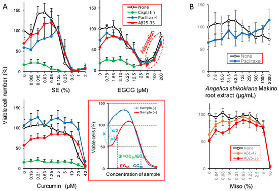 Alkaline extract from the leaves of Sasa senanensis Rehder (SE) protected the cytotoxicity induced by paclitaxel and Aβ25–35, but not the cytotoxicity induced by cisplatin. Epigallocatechin gallate (EGCG) and curcumin showed some protective activity when induced by Aβ25–35 (Figure 5A).