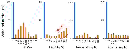 There was a possibility that neuroprotective effects may be related to the growth stimulation against PC12 cells. To test this possibility, PC12 cells were cultured for 24 h in a serum-free medium containing various sample concentrations. The removal of serum from the cultured medium reduced the growth potential of PC12 cells to 10% of the control level (Figure 6). By the addition of SE, the viability returned back to 40% of the control level, whereas the growth stimulation effects of EGCG, resveratrol, and curcumin was much less (Figure 6).