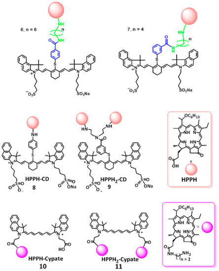 - James, N.S.; Ohulchanskyy, T.Y.; Chen, Y.; Joshi, P.; Zheng, X.; Goswami, L.N.; Pandey, R.K. Comparative tumor imaging and PDT efficacy of HPPHconjugated in the mono- and di-forms to various polymethine cyanine dyes: Part-2. Theranostics 2013, 3, 703–718. [Google Scholar] [CrossRef] [PubMed]