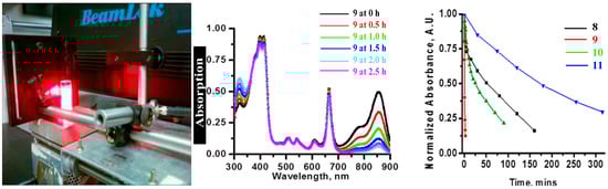 The conjugates: HPPH-CD (8), HPPH2-CD (9), HPPH-Cypate (10) and HPPH2-Cypate (11) shown in Figure 2 prepared by following our own methodology [29,30] were formulated in 17% Bovine Calf Serum/PBS and were used at equimolar concentrations (5 μM). The absorption spectra were measured in 1 cm-quartz cuvettes following irradiation at 661 nm (light dose: 135 J/cm2, 75 mW/cm)2 at various time points until there was nearly complete degradation of the NIRF portion of the conjugate (Figure 3).