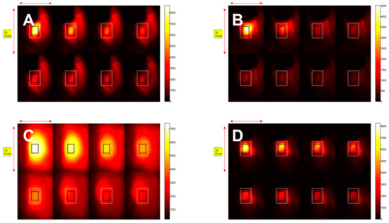 In vivo photobleaching of the CD in (A) HPPH-CD (8), (B) HPPH2-CD (9), (C) HPPH-Cypate (10) and (D) HPPH2-Cypate (11) conjugates in Colon26 tumors implanted in BALB/c mice. All conjugates were irradiated at 665 nm, after 24 h post-injection and treated at a fluence and fluence rate of 135 J/cm2 and 75 mW/cm2. Concurrently fluorescence images were taken (wavelength detection > 830 nm) at various treatment times up to 30 min, the total treatment time.