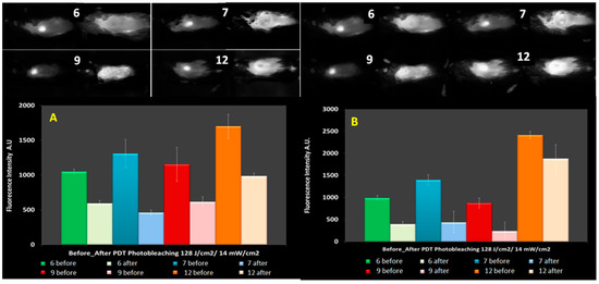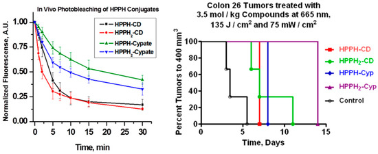 In vivo photobleaching of the conjugates: HPPH-CD 8, HPPH2-CD 9, HPPH-Cypate 10 and HPPH2-Cypate 11 occurred in the order of 9 > 8 > 11 > 10. There were no photodynamic therapy (PDT) cures upon assessment of the tumor response (the tumors were irradiated with light (Figure 4) at 24 h post-injection). The tumor growth was measured daily, when the tumors reached to a volume of >400 mm3, the mice were euthanized following the approved IACUC protocol. Control: The tumored mice were intravenously (i.v.) injected with the PS but the tumors were not exposed to light.