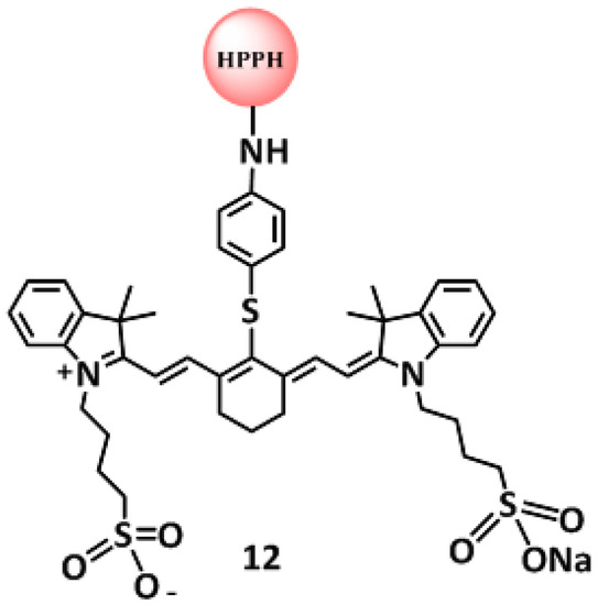 The data acquired from the in vitro photo-induced bleaching of conjugates showed that NIR fluorophore CD of the conjugates photobleached at a much faster rate than HPPH and the rate of bleaching was in the order of 9 > 10 > 8 > 11, which correlated well with their in vivo PDT responses when irradiated at 128 J/cm2 and 14 mW/cm2, using a drug dose of 1.5 μmol/kg. Conjugate 12 produced 80% tumor response, whereas compounds 10 and 11 did not yield any long-term cure. The in vivo photobleaching of HPPH and CD in conjugates before and after PDT suggests that measuring the rate of the photobleaching of CD could be a useful tool to optimize the PDT light dosimetry. We hypothesize that the determining the rate of photobleaching of CD in PS-CD conjugates may help to measure indirectly the amount of singlet oxygen generation during photodynamic therapy treatment at variable light fluence and fluence rates [1,22]. These studies are currently underway. A decreased rate of photobleaching of HPPH over the CD in HPPH-CD conjugates could be due to higher reactivity of singlet oxygen to polymethine linkers present in the CD moiety as shown in Figure 1.